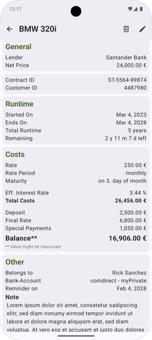 You can also add up to 5 documents of common image types or as PDF, like your legal contract from your lender or whatever you like. And on the detail screen you can open your added documents, with any app installed on your device that supports the file format.